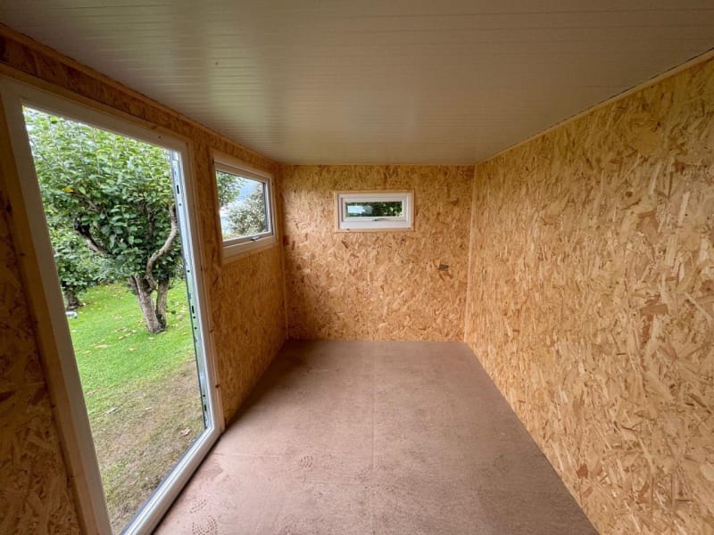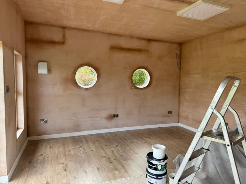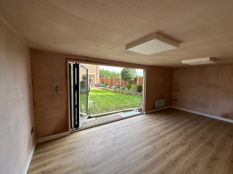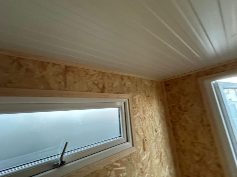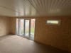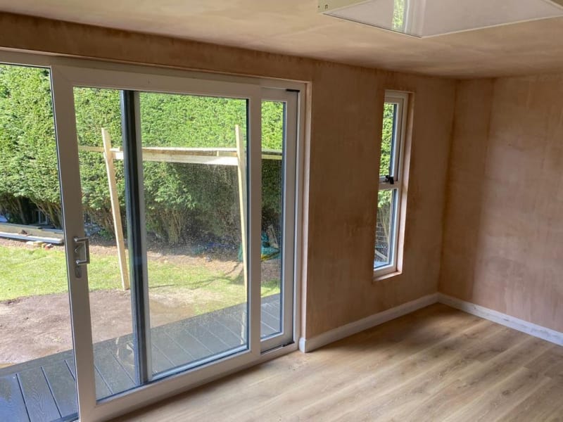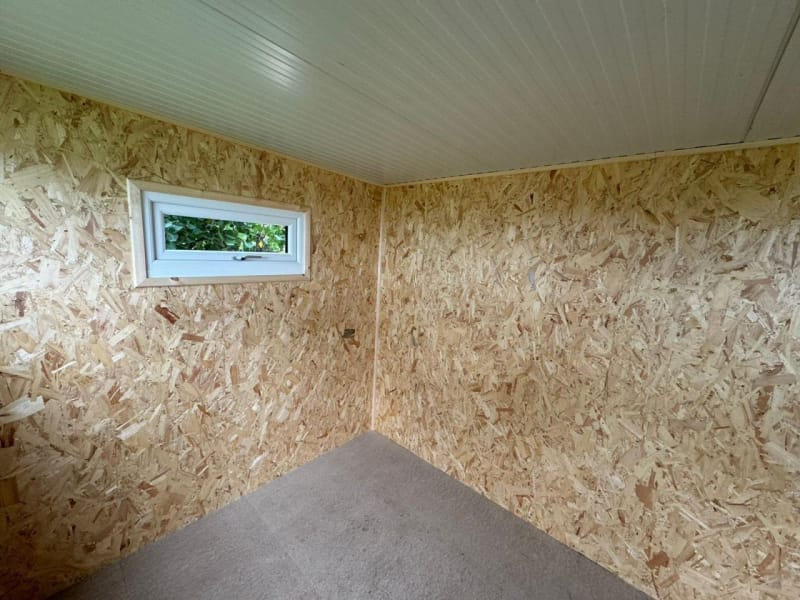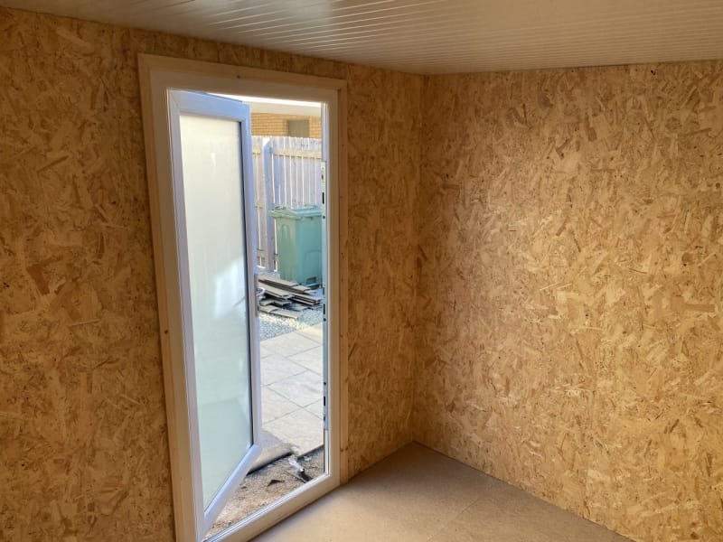 As standard all our garden room buildings are lined with OSB Timber. OSB (Oriented Strand Board) is a widely used engineered wood panel made from layers of compressed wood strands bonded with resin and wax. The strands are oriented in specific directions, giving the board strength and consistency similar to plywood. As an option you can have the inside of your new garden room professionally plasterboarded and plastered. This option will give you an internal finish similar to the inside of a new house.