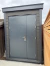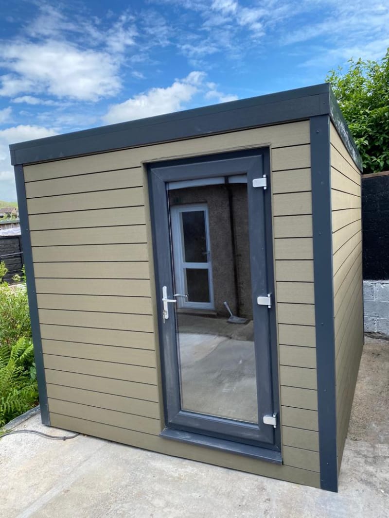 Our woodgrain composite garden sheds and woodgrain composite garden rooms are available in a range of different colours including: Light Grey, Charcoal (Dark Grey\Black), Teak (Light Brown), Coffee (Dark Brown), Redwood, Olive Green and Ivory.