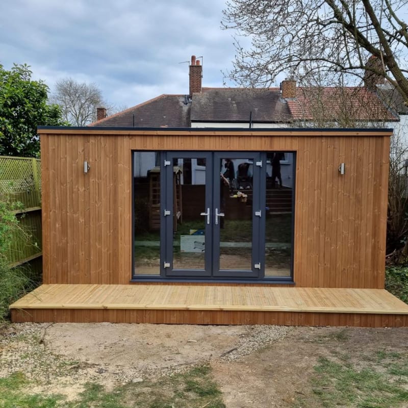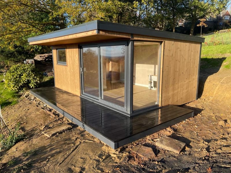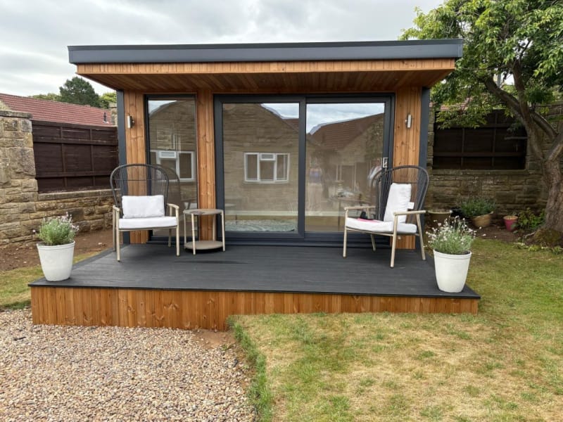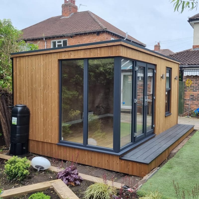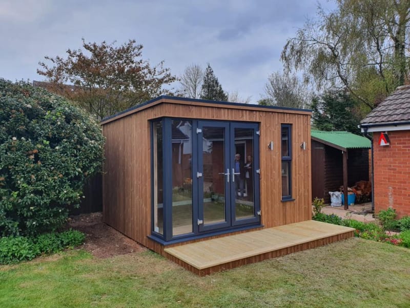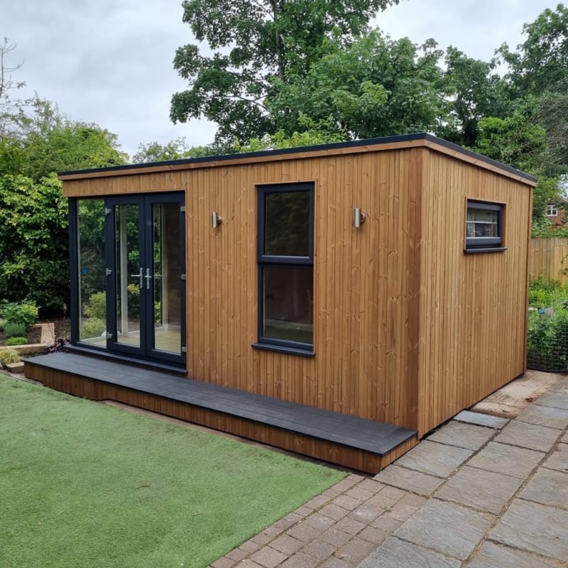Our 2.5m x 2.5m garden room externally finished in thermowood timber cladding.