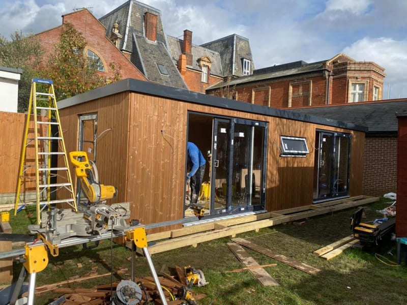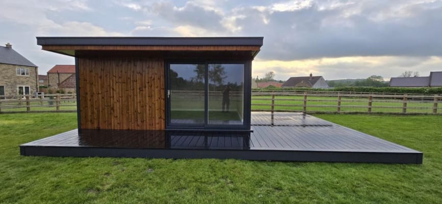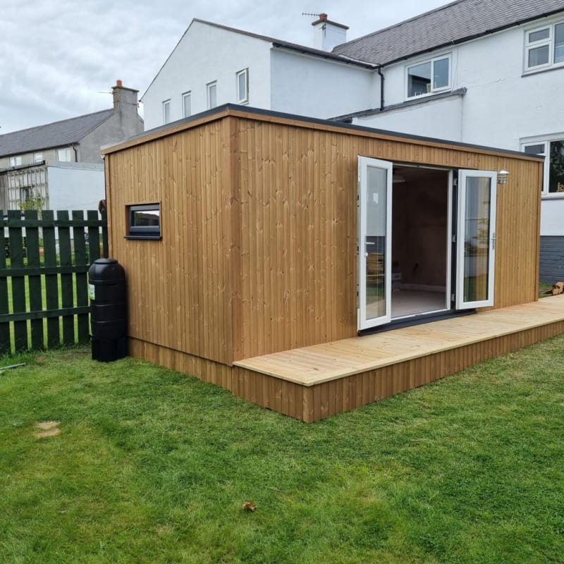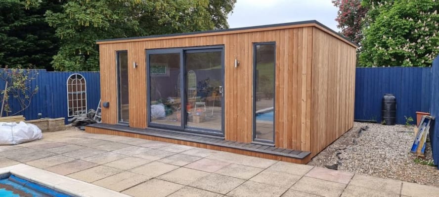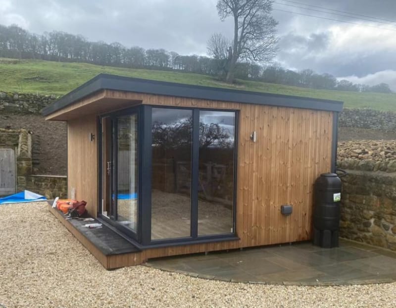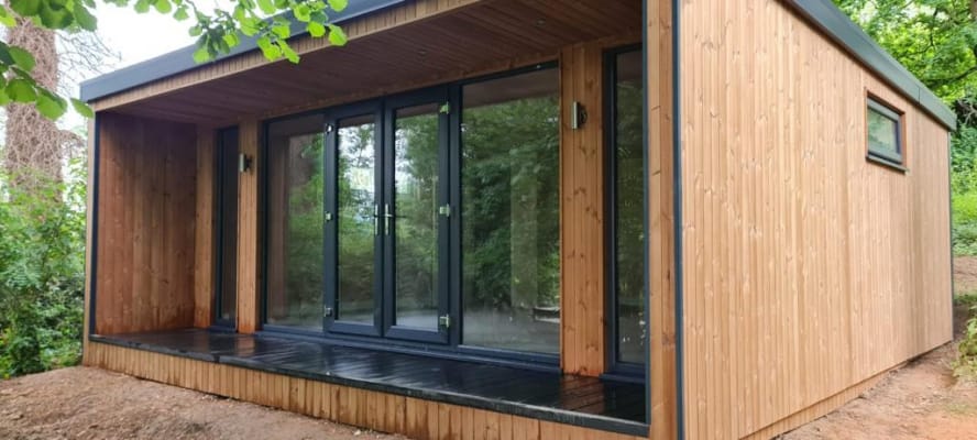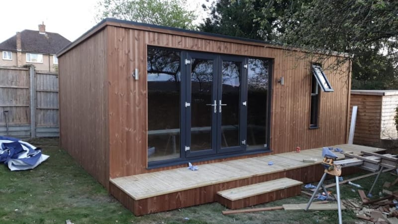 Our 2.5m x 2.5m garden room externally finished in thermowood timber cladding.